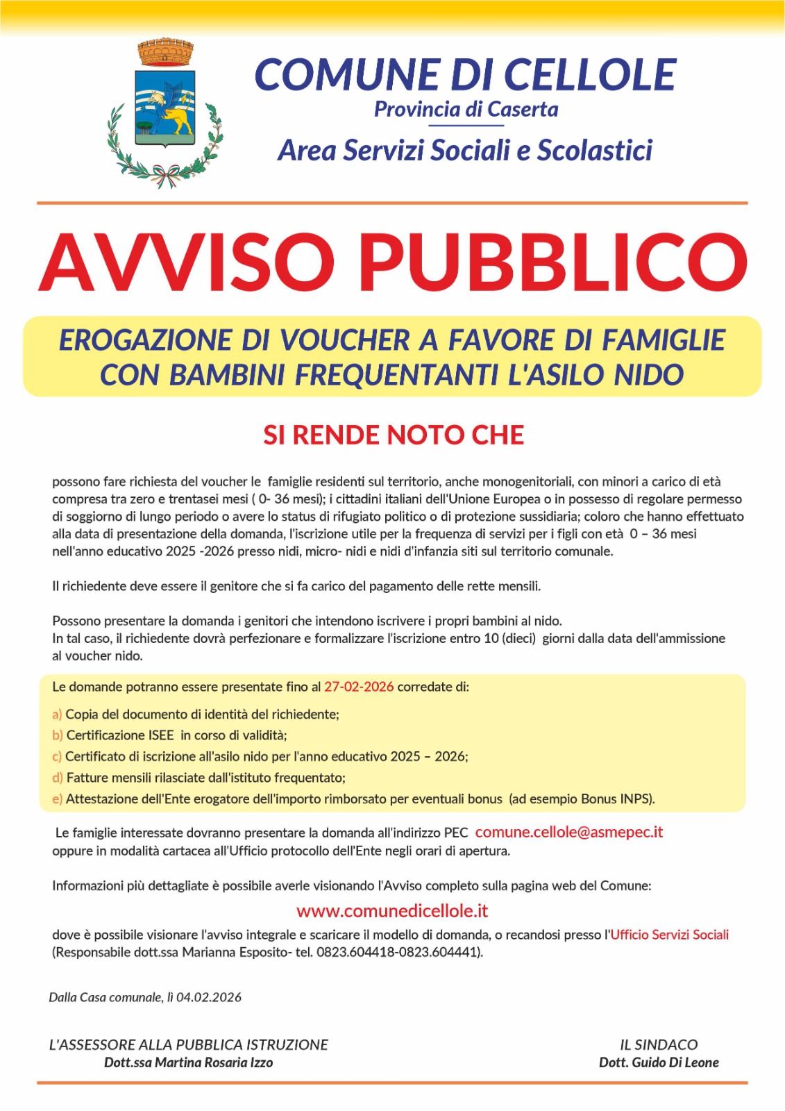- Approvazione della graduatoria per l’assegnazione di voucher nido (3-36 mesi) dal 01.09.2024 al 30 .06. 2025 per i residenti nel Comune di Cellole e liquidazione contributo per il periodo dal 01.09.2024 al 31.12.2024